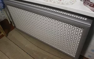Практичным и эффективным методом маскировки является установка окрашенных металлических перфорированных экранов. Они являются самыми прочными из подобных конструкций и имеют неограниченный срок службы. Металлические экраны на радиаторы часто используются как экономичный вариант при оформлении отапливаемых коридоров, дверных проемов и подсобных помещений, поскольку они надежнее пластиковых и дешевле деревянных. Металлические решетки можно устанавливать и в жилых комнатах, поскольку они жаропрочны, нетоксичны и имеют приятный внешний вид.